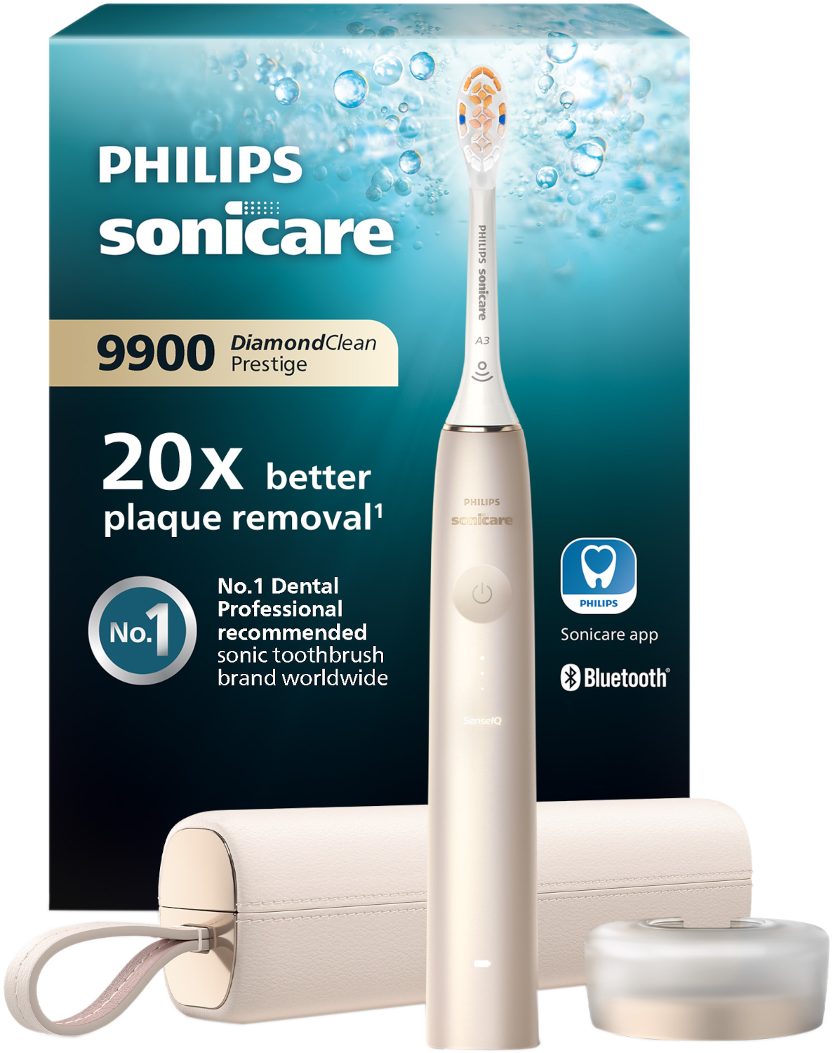 De Philips Sonicare Prestige 9900 HX9992/11 meet met de SenseIQ tot 100 keer per seconde jouw poetsdruk, poetsbeweging, poetsduur en de plekken waar je poetst. Hierop past de tandenborstel zelf de poetsstand en intensiteit aan, zodat je altijd de juiste poetsstand voor jouw gebit gebruikt. Voor meer feedback op jouw poetsgedrag koppel je de tandenborstel aan de smartphone app. In de app zie je jouw voortgang en je krijgt handige tips om beter te leren poetsen. Bij de tandenborstel ontvang je een alles-in-één opzetborstel, die met driehoekige uiteinden en lange borstelharen ook de moeilijk bereikbare plekjes goed reinigt. Zodra de borstel aan vervanging toe is, krijg je een seintje op het handvat. Zo weet je zeker dat je altijd effectief en hygiënisch je tanden poetst.