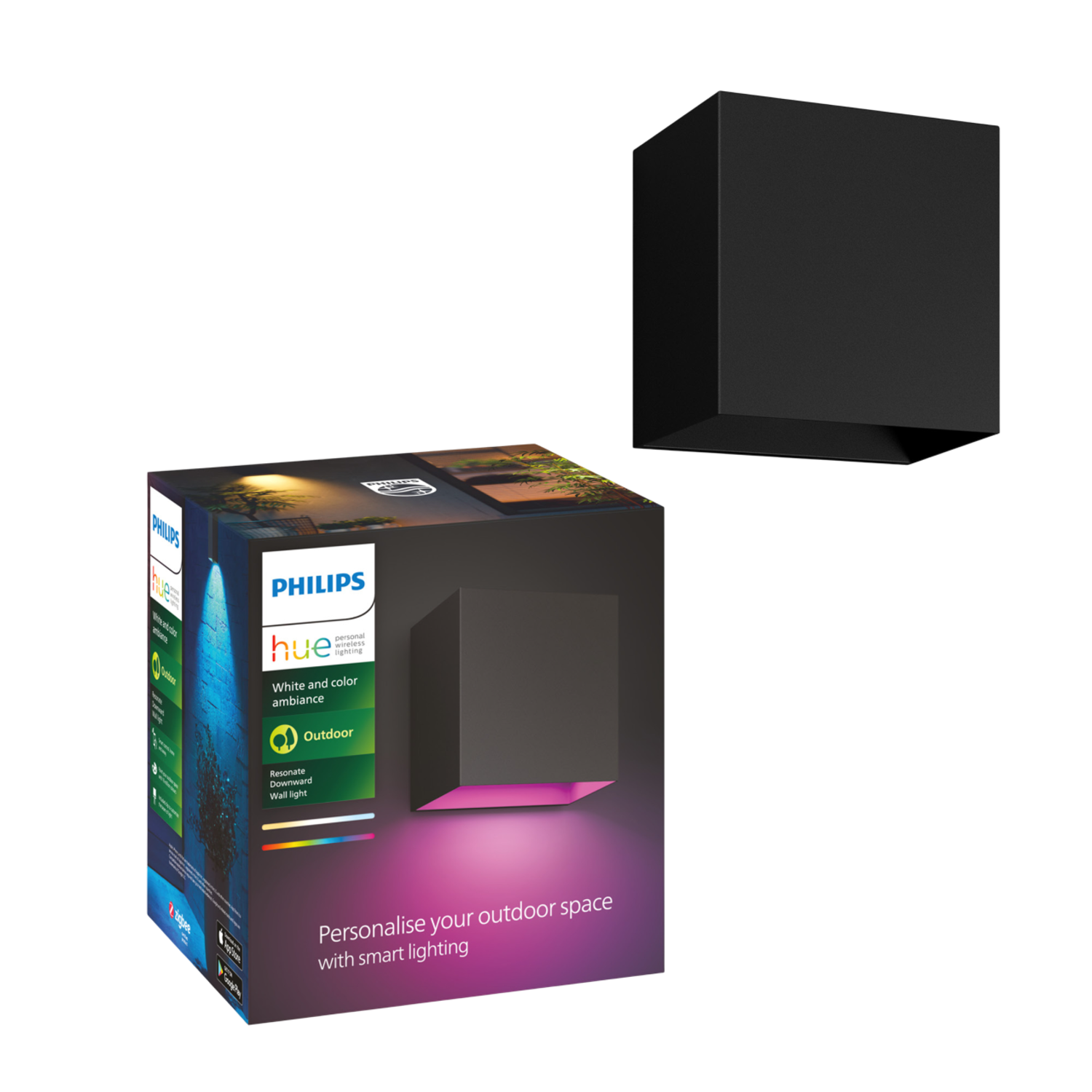 De Philips Hue Resonate Downward White and Color muurlamp brengt kleur in je tuin. Deze lampen hebben een neerwaartse lichtdriehoek die je met de meegeleverde klem breder of smaller maakt. Zo creëer je bijvoorbeeld een speels effect. De lampen zijn vrij klein en subtiel, waardoor ze in iedere tuin passen. Deze lamp geeft 16 miljoen verschillende kleuren en iedere tint wit licht. De lamp is gemaakt van aluminium. Je verbindt de lampen aan je Hue bridge waarna je ze overal bedient en vaste routines instelt. De lichtbron is ingebouwd en vervang je dus niet zelf. Je sluit de lamp aan op het lichtnet, dus er moet een stroomkabel naar je lamp gaan.