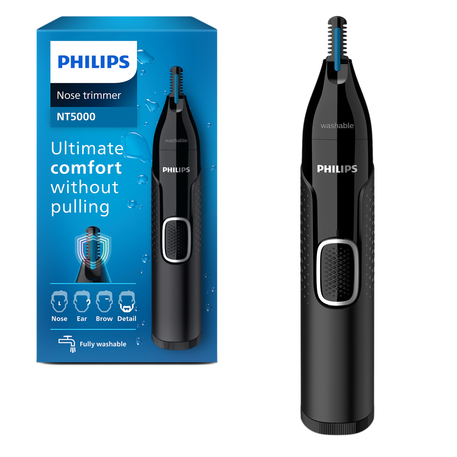 Trim comfortabel je ongewenste haren met de Philips NT5650/16. Dankzij de huidbeschermer en PrecisionTrim technologie heb je geen last van een trekkend gevoel en wondjes na je scheerbeurt. Met de verschillende opzetkammen vorm je zowel je neus- en oorhaar, als je wenkbrauwen en bakkebaarden precies zoals jij dat wil. Klaar met trimmen? Spoel de trimmer dan eenvoudig af onder de kraan. De trimmer is namelijk volledig waterbestendig.